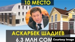 Открывает список член фракции «Бир Бол» Аскарбек Шадиев с годовым доходом в 6 млн 284 тысячи сомов. При этом личные доходы парламентария за 2015 год составили всего 99 тысяч 403 сома. Таким образом, экс-министр энергетики получал намного ниже среднего размера зарплаты по стране – всего 8 тысяч 283 сома в месяц. Из личного имущества у депутата дом на 420 квадратных метров и два ОсОО, в которых он имеет по 50% доли.