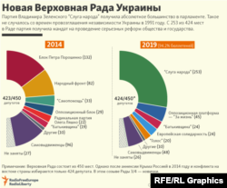 Помимо фракции "Слуги народа", в новом парламенте есть фракции еще четырех партий – "Батькивщина", "Голос", "Европейская солидарность", "Оппозиционная платформа – За жизнь". 26 кресел будут пустовать, так как они закреплены за представителями неподконтрольных Киеву регионов Донецкой и Луганской областей Украины, а также аннексированного Крыма и Севастополя. Среди депутатов будет 46 самовыдвиженцев и по одному представителю еще четырех партий, которые были избраны по мажоритарным округам.