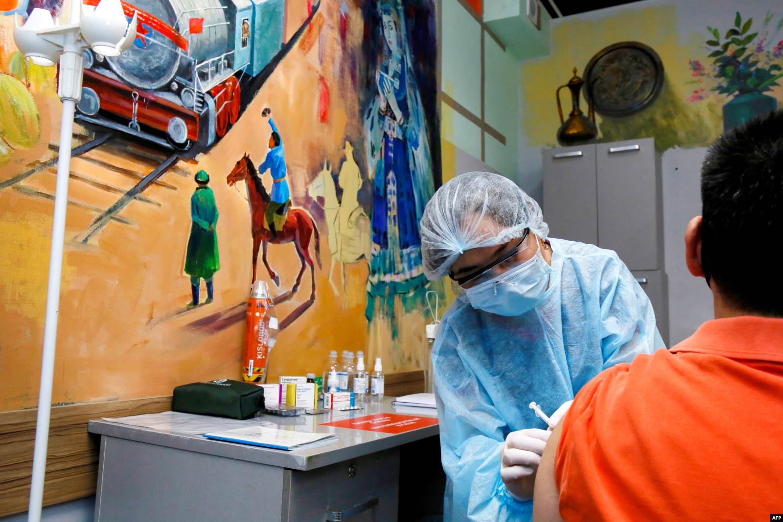 Мужчина получает прививку от коронавируса. Алматы, 17 апреля 2021 года.
